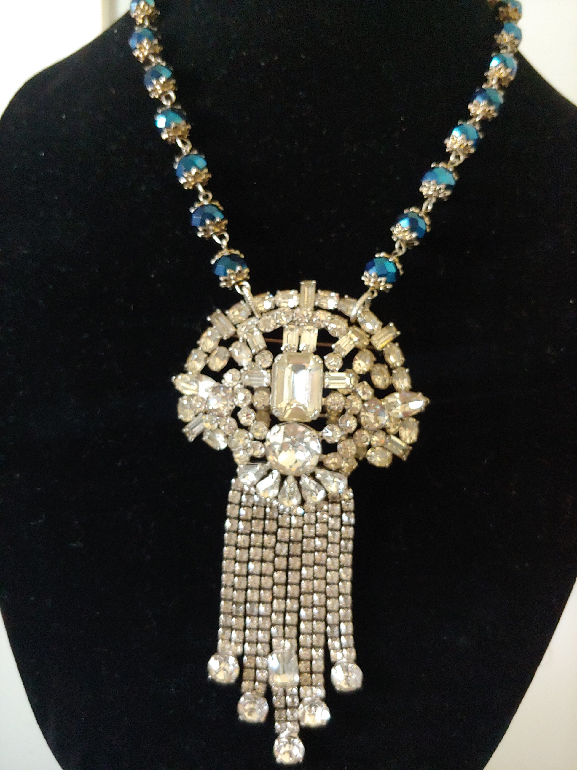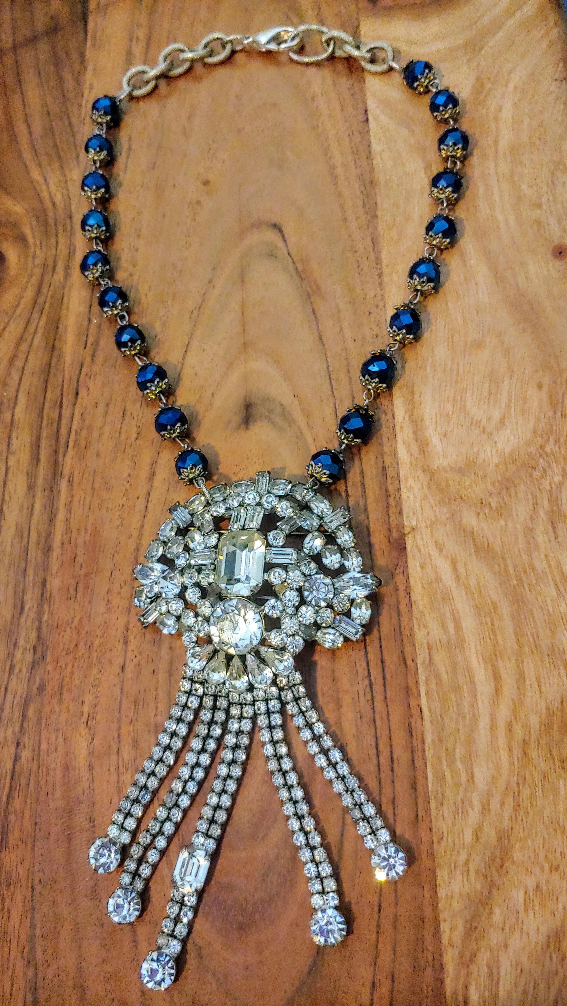 Don't Go Chasin' Waterfalls is a true one-of-a-kind beauty. This dark blue faceted beaded necklace with a perfect 1950's waterfall brooch from a Decatur diva will turn all the heads. Leos, where you at? All attention will be on you with this one!