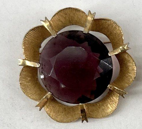 You're going to need a flyswatter to keep everyone away with this one. Beautiful smokey purple glass set in a brushed gold scalloped setting. This pendant hangs tough on a super chunky gold-tone 17" necklace with a 2" extension. Photos do not do this one justice.